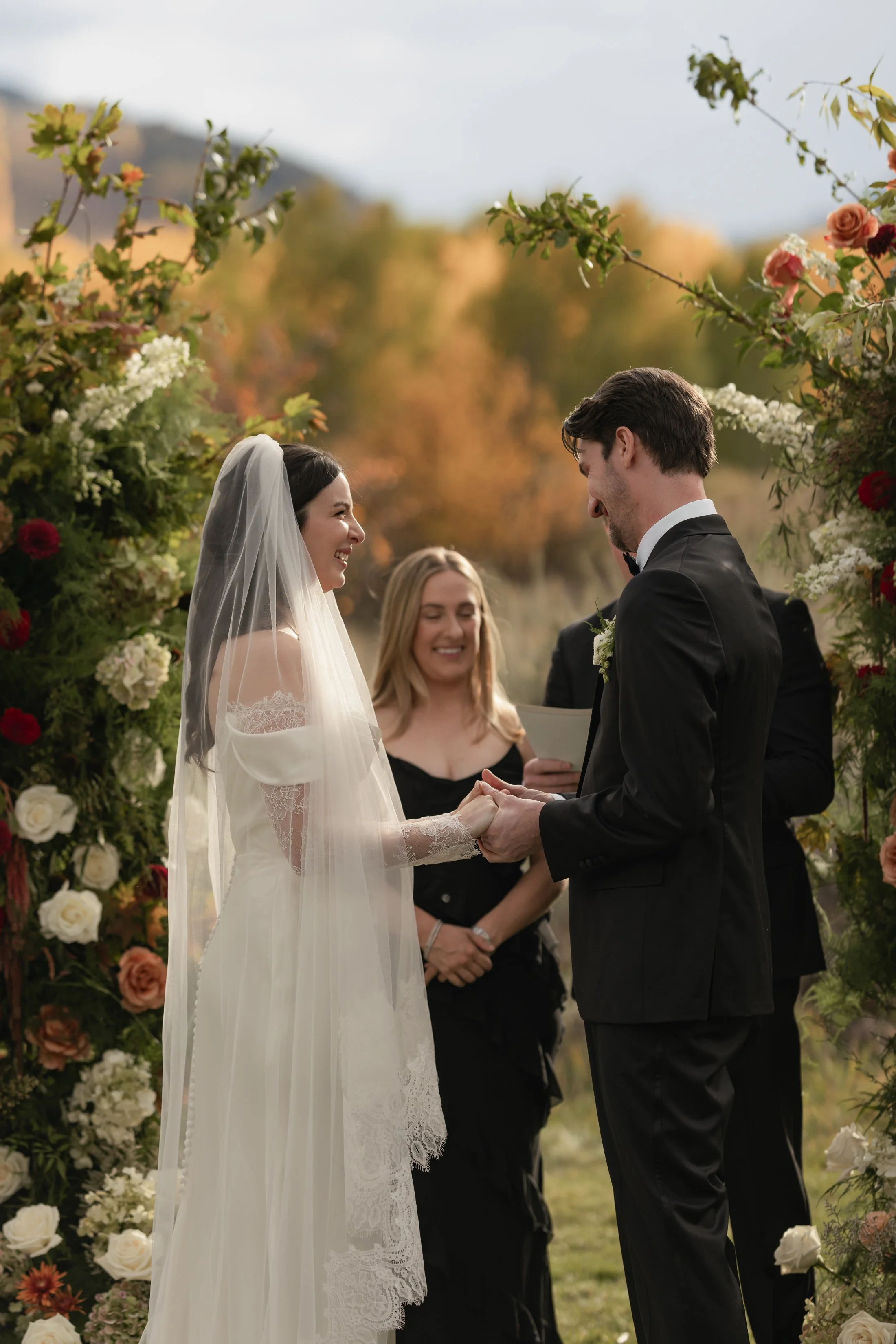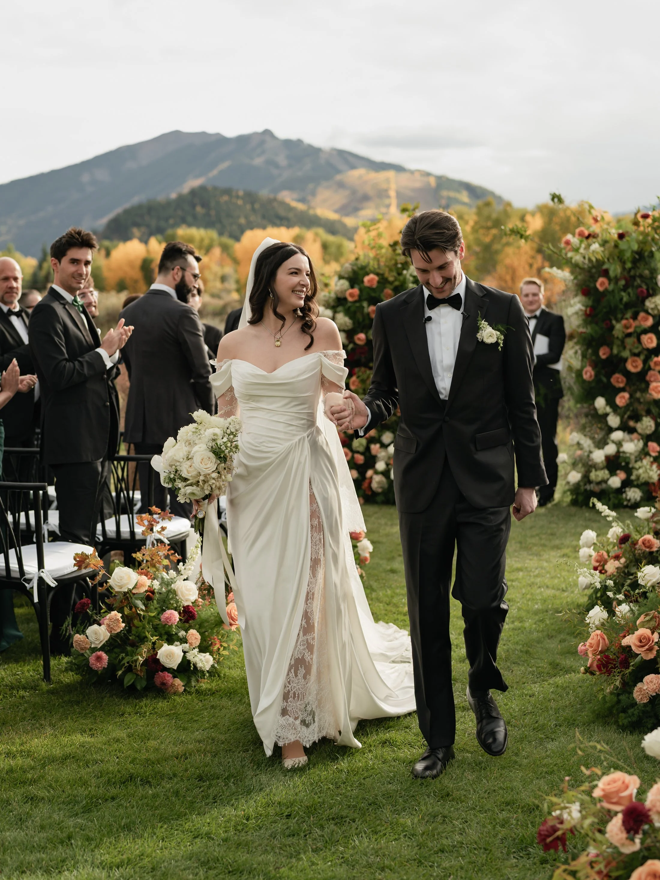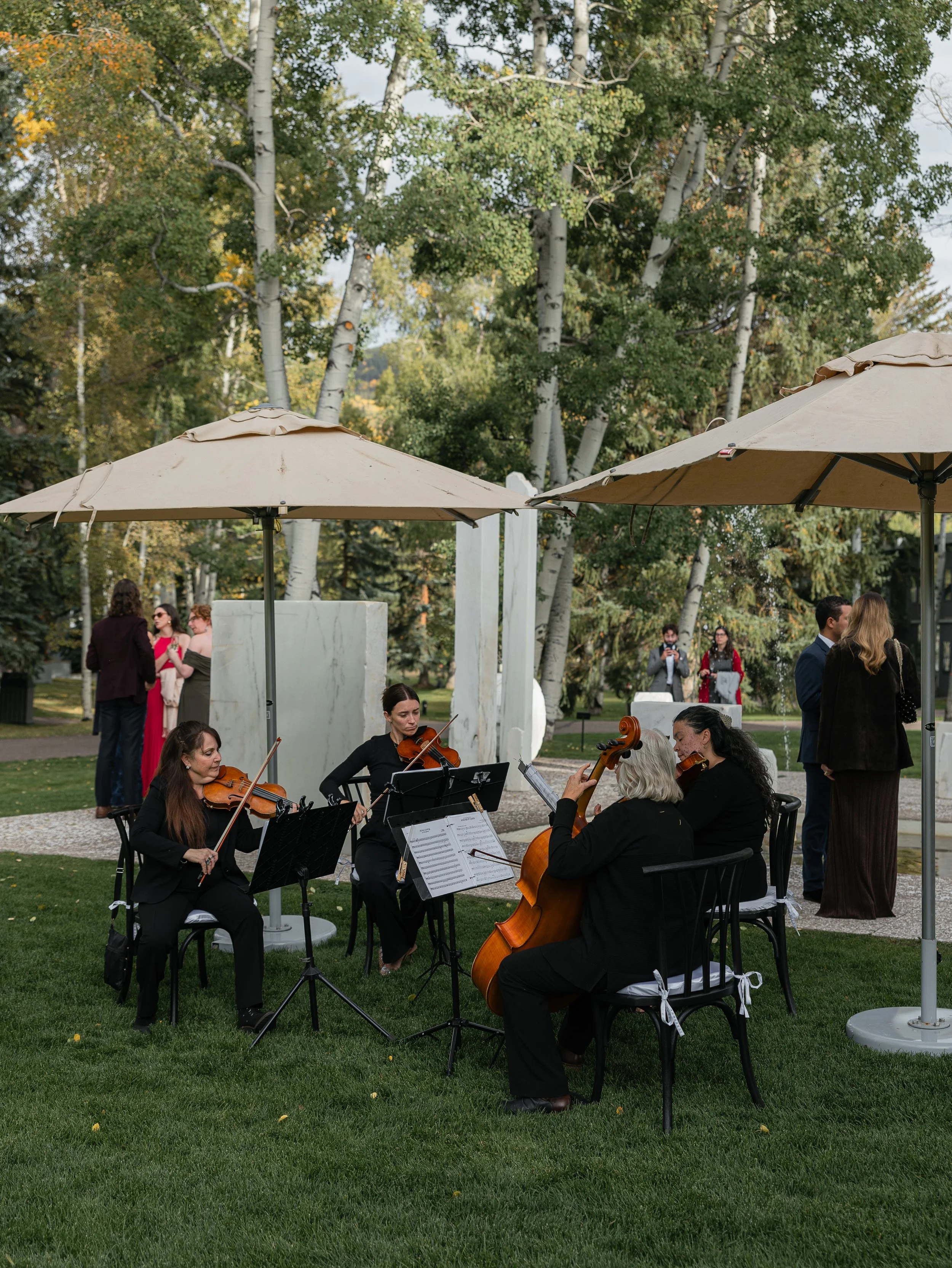 At Anderson Park in Aspen Meadows, Alice and Tommy exchanged vows surrounded by golden aspens, a lush fall-forward florals by Something Styled, and panoramic mountain views. Guests gathered on the lawn under clear skies, with live strings setting a romantic, timeless atmosphere.